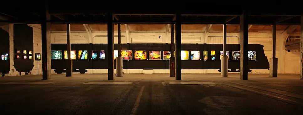 Le train se met en mouvement, et la lumière balaie les fenêtres pour agiter les couleurs. L’intérêt n’est plus le paysage extérieur mais l’ambiance intérieure qui change au gré de la météo et des heures qui passent ; comme une introspection. L’oeuvre est non seulement en mouvement mais prend vie… toujours la même mais jamais vraiment la même. Que le soleil brille et irradie le wagon, que les ombres (des arbres et nuages) s’invitent dans la scène ou que la pluie vienne jeter contre les vitres et dessiner de nouveaux motifs sinueux ou perlés… le spectacle continue. L’oeuvre n’est pas statique, c’est une animation de l’instant. Le coucher ou le lever de soleil seraient alors tout aussi merveilleux que sur un bord de mer… quant à la nuit et ses lumières artificielles, ajouteraient un rythme dynamique faisant surgir la couleur de l’obscurité (sans doute d’une manière proche de l’ambiance recréée à la Urban Art Fair).