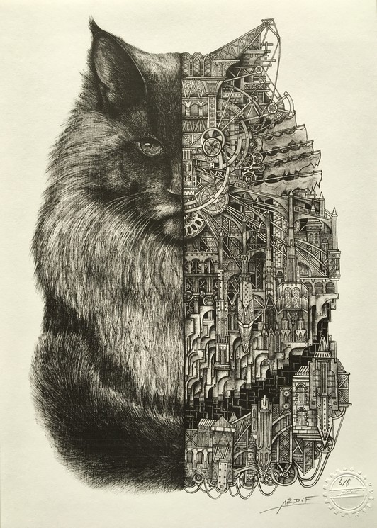 Le charme opère enfin grâce à une technique de dessin minutieuse. De sa formation d’architecte, Ardif a, notamment, su mettre à profit la maîtrise précise du trait, des proportions et des formes géométriques qui participent indéniablement à la crédibilité de cette hybridation animale, mécanique et architecturale.