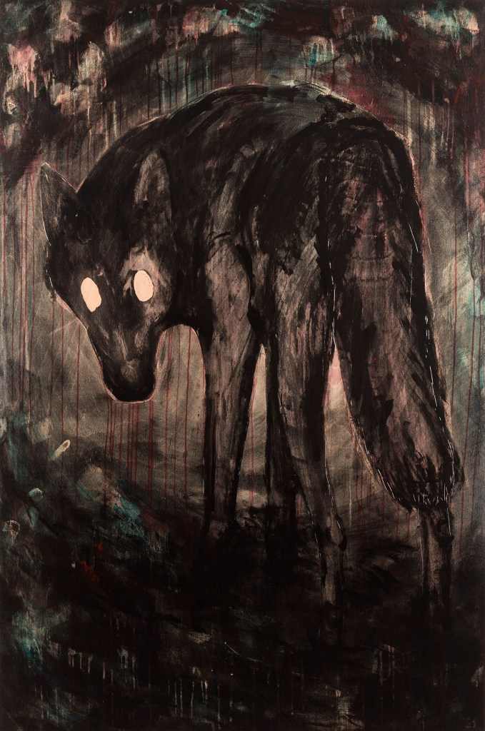 Seul ou en horde… ombre furtive et fuyante ou silhouette à la croupe hérissée, aux yeux brillants et aux crocs acérés ; le loup s’invite dans les compositions de diverses manières. Il peut être protagoniste mais aussi plus en retrait, spectateur, lorsqu’il erre comme le dernier survivant d’un monde post-apocalyptique, le dernier témoin des vestiges de l’humanité. Il paraît alors bien inoffensif dans ces espaces désolés qui suggèrent bien plutôt que « l’homme est un loup pour l’homme ». Et si les véritables loups n’étaient autres que nous-mêmes ?