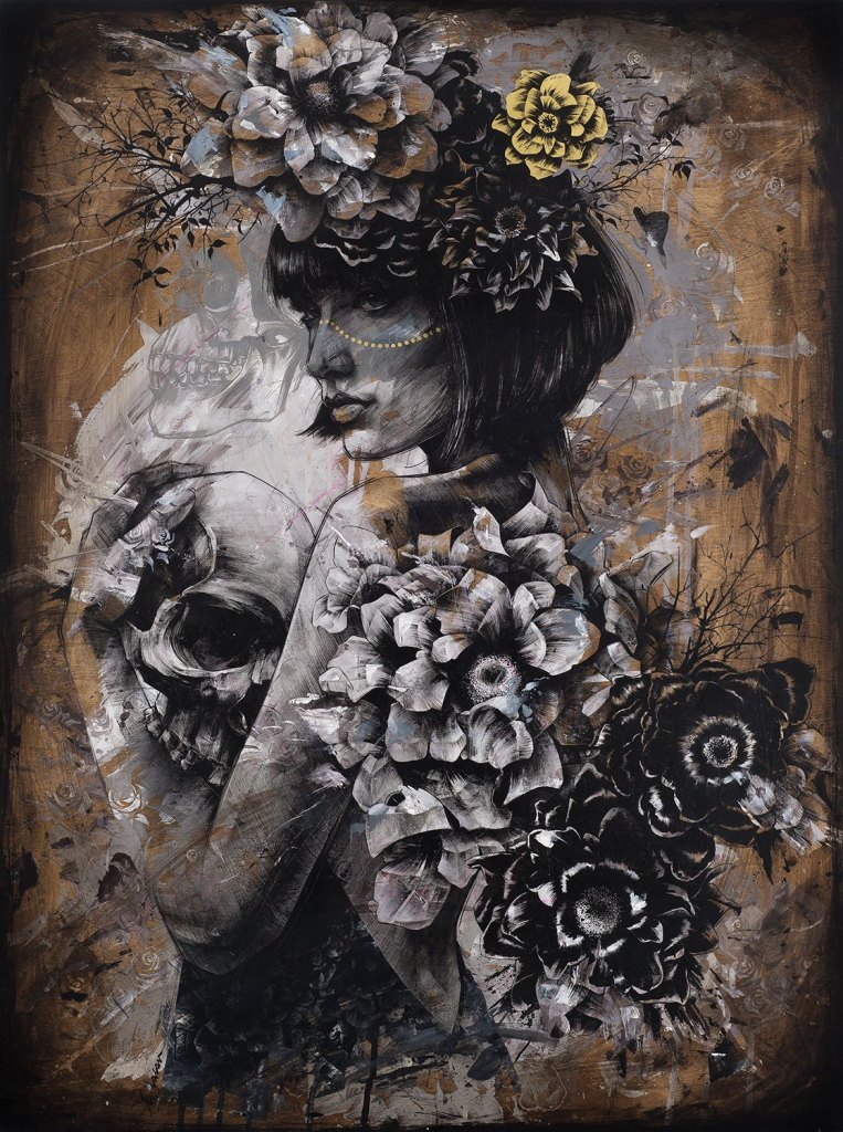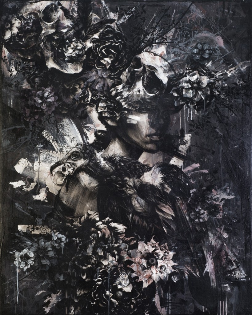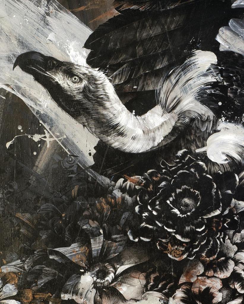 Une jeune femme est toujours présente au centre (mais peut-être moins protagoniste dans cette oeuvre) car elle apparaît comme un élément plus immobile… une fleur parmi les fleurs… une nature morte. Elle n’est pas au premier plan mais un peu en retrait, le corps de profil et le visage légèrement tourné vers l’observateur. Ses yeux et une partie de son visage comme son corps restent dans l’obscurité. Autour d’elle, de nombreux éléments semblent comme jaillir de la toile. Depuis le bas de la composition jusqu’en haut, on retrouve les fleurs noires et blanches et des branchages. A ses côtés et au premier plan, un vautour tenant un petit crâne dans son bec viendrait presque lui voler le rôle principal… Le rapace dévoreur de charognes et la belle jeunesse cohabitent à nouveau (paisiblement bien que leurs regards soient dirigés à l’opposé l’un de l’autre).