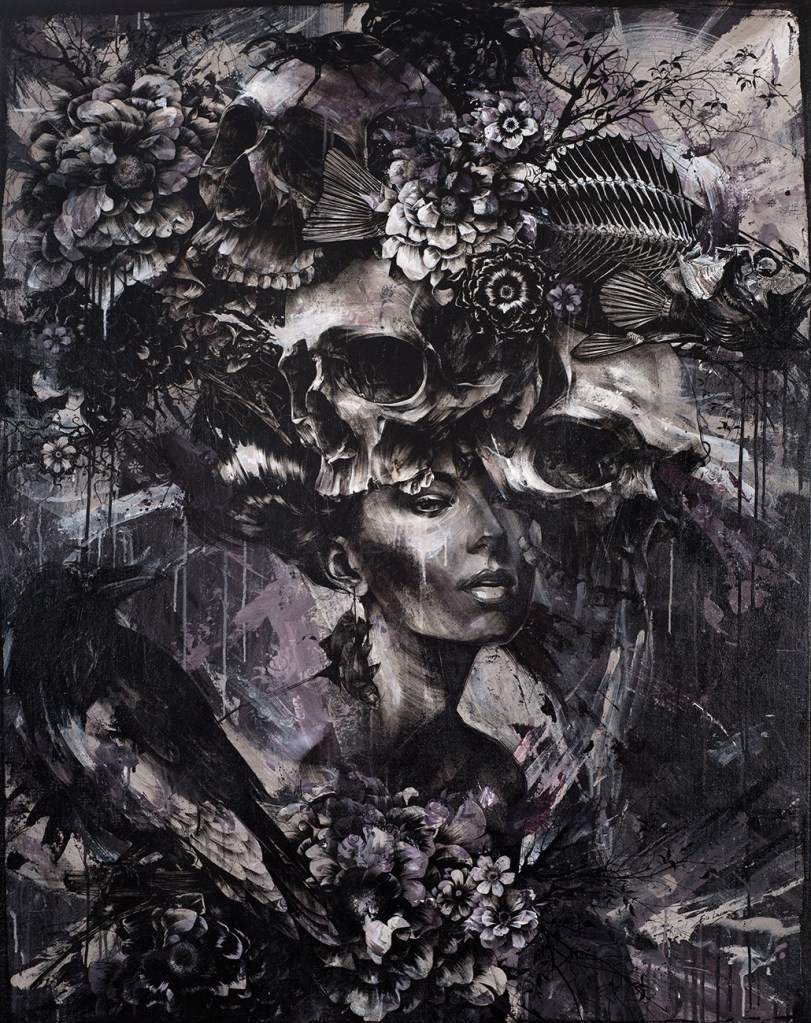Ici la femme est seule au centre de la composition, émergeant parmi les fleurs et concentrant la lumière autour d’elle. Le visage légèrement en arrière et l’oeil dirigé vers l’observateur lui donne un air élégant et imposant. Son visage est à moitié dissimulé et sa tête ornée d’une coiffe démesurée composée de trois grands crânes, de fleurs, de branchages, d’un squelette de poisson et d’un lucane placé tout en haut comme juché sur un poste d’observation.