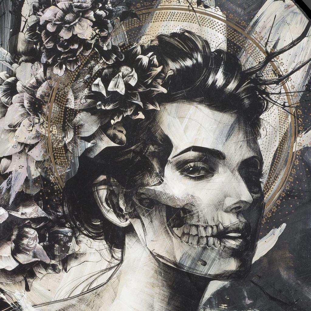La beauté du personnage féminin qui se tient au centre contraste avec le crâne qu’elle tient entre ses mains. Dans l’histoire des vanités, on ne ressent pas la crainte en jouxtaposant la vie/la jeunesse et la mort… Il en va de même ici, alors même qu’un second crâne se distingue en filigrane devant le visage de la femme, comme une projection de son destin. Elle le chérit même comme l’une de ses possessions, un accessoire précieux qui souligne encore sa beauté. Elle se tient debout, le port haut dans une robe dos-nu, le visage tourné vers l’arrière sans toutefois regarder l’observateur. Le regard est assuré et encore affirmé par la frange d’un carré impeccable.