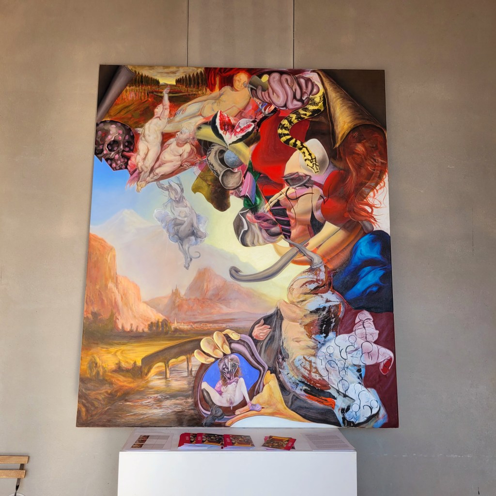 Five large canvases presented in symmetry… the moment has something solemn and miraculous… liturgical. The gallery becomes a nave… a sacred place. Wherever the gaze lands, the frenzy of shapes and colors draws the viewer into figurative landscapes where paradises mingle with sins. The smell of incense mixes with the scent of flowers, overripe fruit, sex and stormy rain. Temptation meanders between gluttony and lust. We find vanities (skulls, fruits, flowers, meat, butterflies, soap bubbles, etc.) dramatized… living-still-lifes… dreamlike landscapes (peaceful and tumultuous) and mutating figures (divine and monstrous). It is a state of pleasure and decadence… of intense duplicity. However, there is a form of revelation… of the last frontier… embodied by the curtain… red like the Passion. In the manner of Rembrandt, the curtain (the velum) helps to directly involve the viewer who becomes an actor in the pictorial fiction… discovering what is hidden behind (like the door to a tomb). The artist is a revealer of secrets, of something beyond, and makes the viewer complicit.