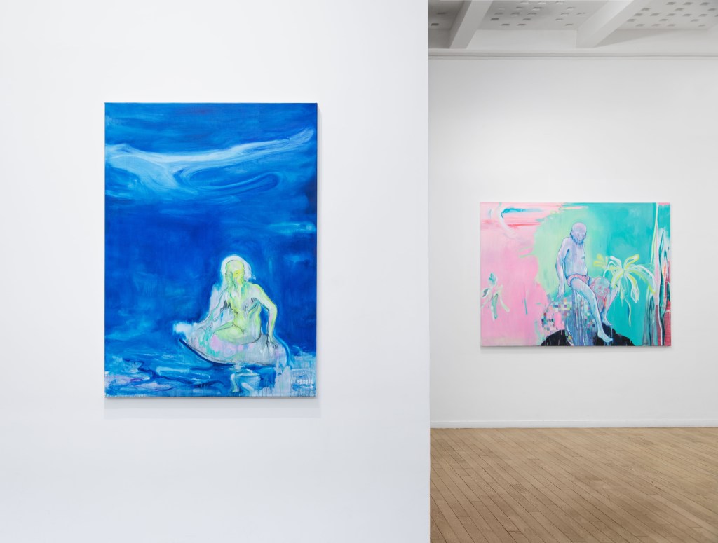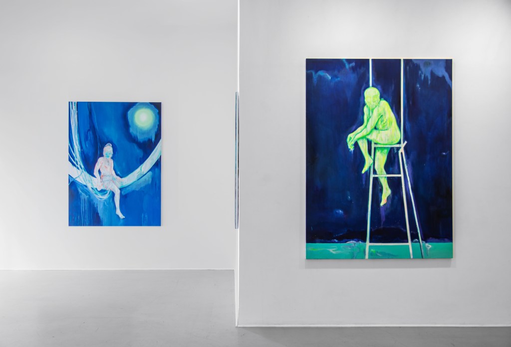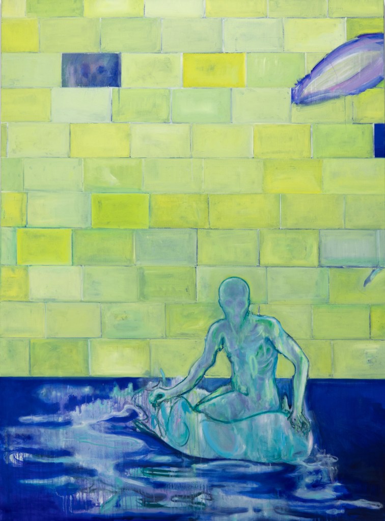 C’est une narration qui nous entraîne au cœur de la galerie, pour nous confronter à ces grands formats colorés et à ces humanités complexes et contradictoires. Les figures se dessinent au centre de la toile comme une apparition… une inquiétante étrangeté qui, selon Freud, nous est aussi familière qu’elle nous alerte. On se reconnaît dans ces miroirs magiques mais on se fait peur aussi. Le reflet nous renvoie à ces visages anonymes… ils pourraient être nous comme quelqu’un d’autre… derrière ces expressions floues et ses regards pénétrants. Ils donnent même parfois l’impression de porter un masque de comédie ou de tragédie… un rôle social. C’est tout le paradoxe existentiel, cette coexistence du rire et des larmes comme celle de la vie et de la mort. Ces êtres, généralement seuls, apparaissent souvent suspendus au-dessus du vide… sur un Hamac ou sur un trône… ou bien flottant à la surface sur une bouée… une embarcation de fortune. Rester à la surface de la galerie… puis descendre au sous-sol comme dans les profondeurs contribue à renforcer cette sensation de flottaison et de submersion… cette appartenance à l’ombre et à la lumière dans la manière dont l’humanité essaye de ne pas perdre pied et de donner le change.
