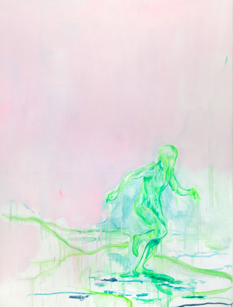 Il y a une sorte de précarité et de vulnérabilité dans cette posture et la vie devient un état de survie et de résilience. On touche a une forme d’expressionnisme dans les horizons tumultueux et les regards tournés vers le spectateur… comme vers quelqu’un qui aurait fait intrusion. Le temps est suspendu sur la possibilité d’une méfiance ou d’une hostilité envers celui qui regarde… l’autre que soi. Les couleurs ont parfois des connotations toxiques… dans les radiations du soleil ou celle d’un corps qui semble enduit d’une substance acide… dégoulinante…. l’être dissout ou englouti par son propre environnement. Pourtant, il n’est pas question de désespoir ou de résignation… au-delà de la cage, du mur, de la dérive ou du naufrage… il y a toujours une lueur d’espoir qui surgit du miroir… trous dans le mur, ballons dans le ciel… comme la promesse d’un avenir meilleur. Vivre c’est finalement rompre la malédiction originelle.