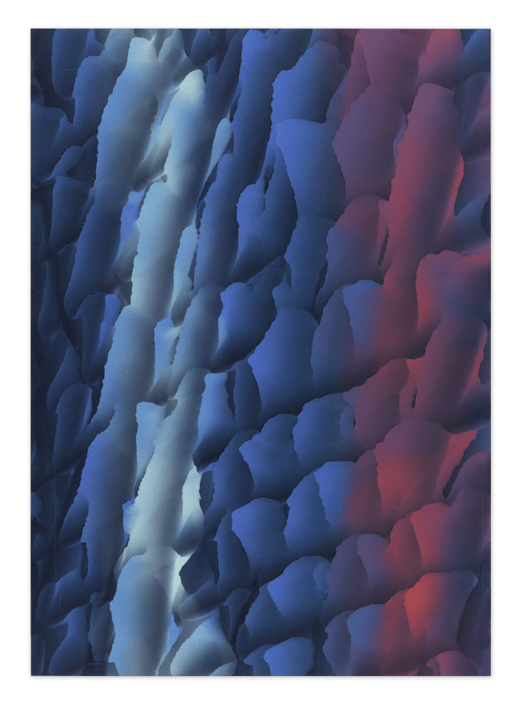 Quant à François Nugues, la lumière et la couleur de ses toiles frappent comme à la surface d’un relief ou d’une texture pour mieux en souligner les aspérités, la douceur, la déchirure ou le tranchant. Il suggère des sensations possibles, non seulement visuelles mais aussi tactiles. Il donne l’illusion de la matière, du rayonnement, de strates, de plans successifs qui se propagent dans le lointain comme une onde. Les fréquences se répondent et se matérialisent dans ces géométries lointaines, aussi naturelles qu’artificielles. Il est alors possible de ressentir la vibration même de la lumière à travers le corps. Duotone, camaïeu ou palette plus élargie, la couleur joue souvent avec l’ombre pour mieux simuler l’objet, son mouvement, et tromper le regard du spectateur dans des profondeurs et des distances illimitées.