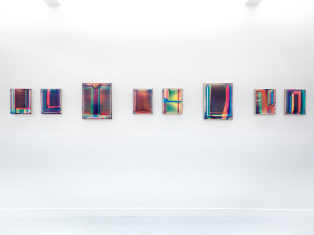 Les œuvres de Ryan Crotty jouent sur deux dimensions… la superposition des couleurs et leur complémentarité. Par transparence, les couleurs s’ajoutent et se mélangent. On observe la formation des rayons comme une décomposition de la lumière blanche… phénomène commun à l’arc-en-ciel, au spectre de Brocken ou encore au verre posé sur une table en plein soleil. De cette manière, il rend visible le spectre et toute la palette de l’artiste. Les couleurs primaires et secondaires s’expriment, s’illuminent dans ce travail d’alchimiste… un savant mélange qui provoque un chevauchement comme des surimpressions aux airs d’aurores boréales.