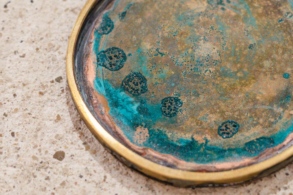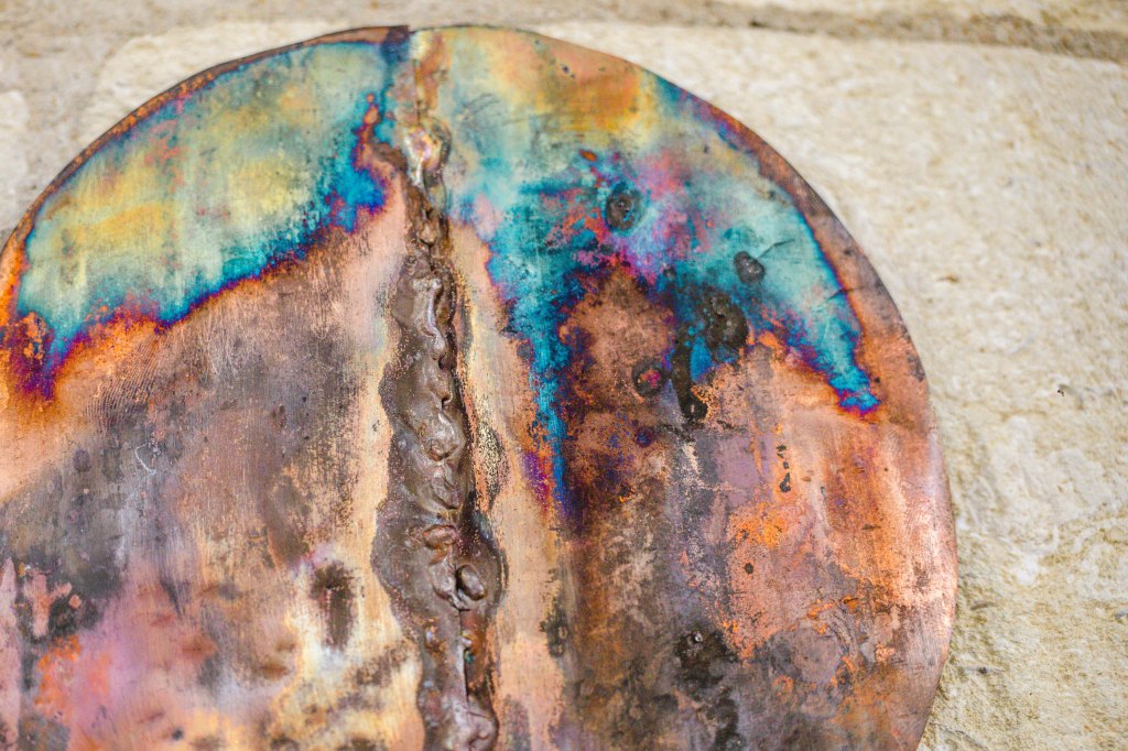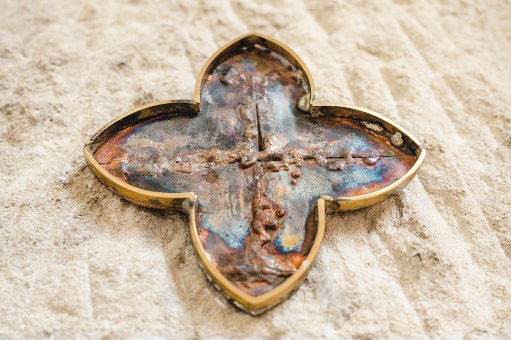 On fait face à un espace liminal où la symétrie et la régularité des œuvres suggèrent, un cheminement linéaire où les portraits sont autant de phrases dont les sculptures en métal deviennent la ponctuation. Plus abstraites, elles complètent et insufflent le rythme narratif… respirations et intonations de ces œuvres qui nous mènent vers le chœur… un chant liturgique où le métal apporte des touches chaudes de couleur comme une enluminure. Cuivre et argent… la forme devient ornementale et précieuse. Elle se fait tantôt l’écho de l’architecture tantôt celle de l’esprit… un outre-corps infini. Du quatrefoil gothique au cercle universel… il règne une grande harmonie dans cette alternance de toiles et de sculptures, comme un dialogue entre l’âme et le corps qui se conclut par un triptyque incarné aux visages multiples… un agrégat d’identités plurielles.