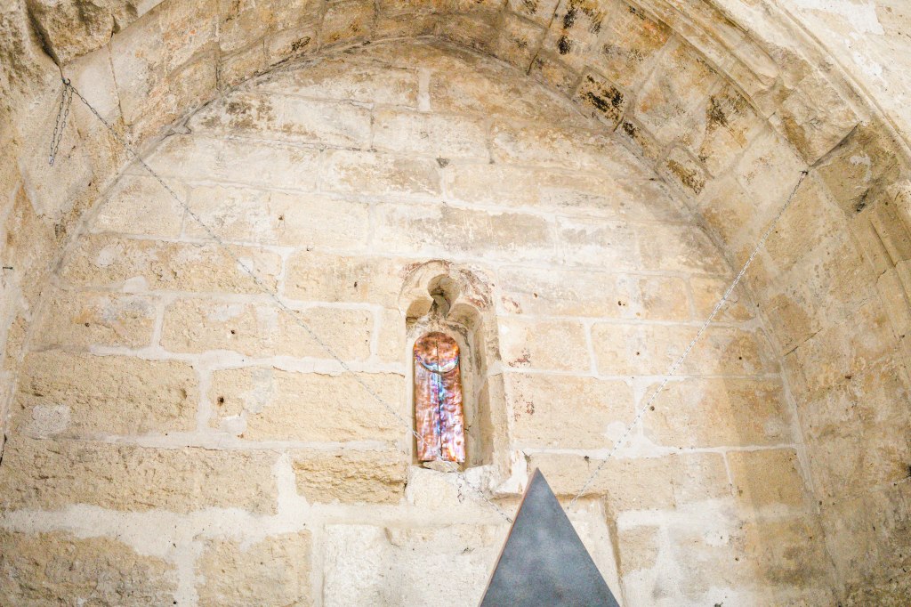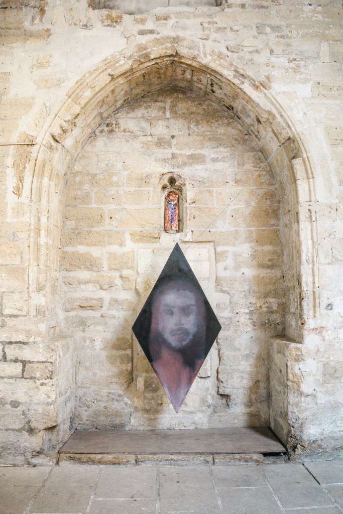 Quant à l’installation monumentale, elle se dresse comme un point de passage incontournable de l’espace pour rejoindre et ressortir chœur. La structure légère fait converger le regard vers un triple visage suspendu, moulé dans le plâtre à la manière d’un Janus observant devant et derrière lui. Autoportrait fusionnel des deux artistes, il suspend littéralement le temps au-dessus de nos têtes. Il nous fige collectivement dans cet instant présent… avant que d’autres expressions, d’autres rides, d’autres histoires… ne viennent s’écrire sur nos visages. Les artistes nous rappellent qu’au fond, nous sommes tous, à fleur de peau, des palimpsestes en mouvement… auteurs malgré nous… à la recherche du temps perdu…