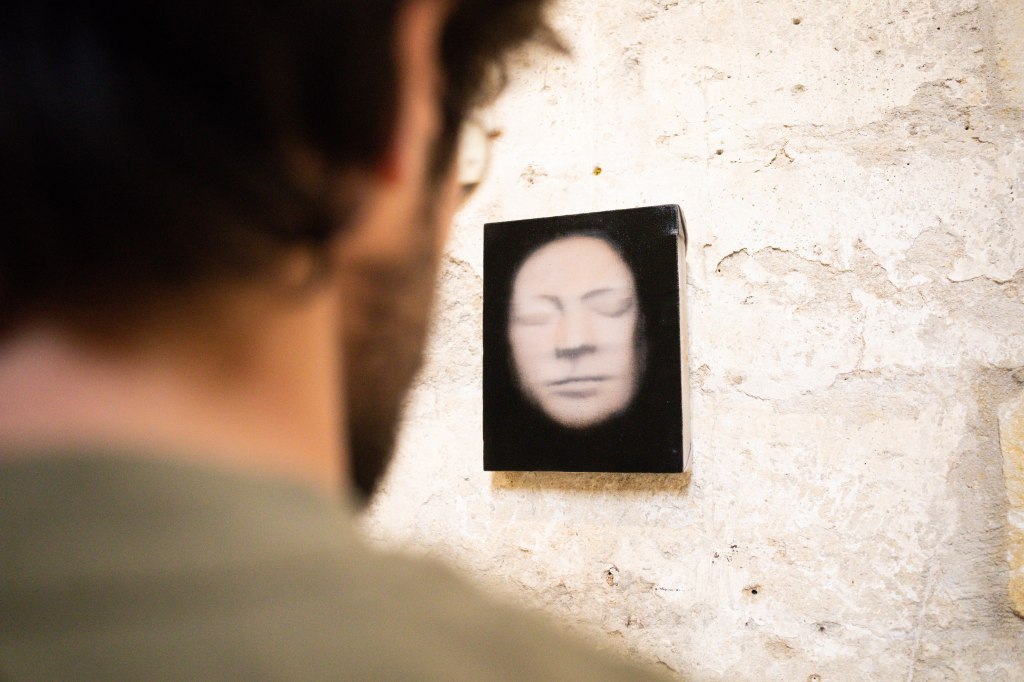 Déjà, les visages semblent s’effacer ou se noyer en eaux troubles… un entre-deux flottant puisque l’on est pris entre l’apparition et la disparition. La peinture noire, opaque mais brillante, qui forme une ombre enveloppante comme une mare ou un linceul, accentue cette sensation d’immersion claire-obscure. Le contraste n’est pas sans rappeler les portraits photographiques sur fond noir qui font surgir la lumière du corps. Il y subsiste quelque chose de vivant… comme gratter l’épiderme pour retrouver les traits enfouis mais lisibles d’une humanité glissante, sans cesse perdue et renouvelée.