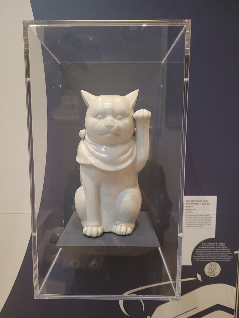 Dès l’entrée, un maneki-neko blanc accueille le visiteur, la patte levée… présage d’un moment de bonheur. Passé le seuil… comme un coffre entrouvert, la lumière surgit savamment de l’obscurité comme une invitation à regarder à l’intérieur… un secret révélé. Si chaque salle a sa thématique, l’expérience de l’art japonais est un tout indissociable… un trésor inoubliable !