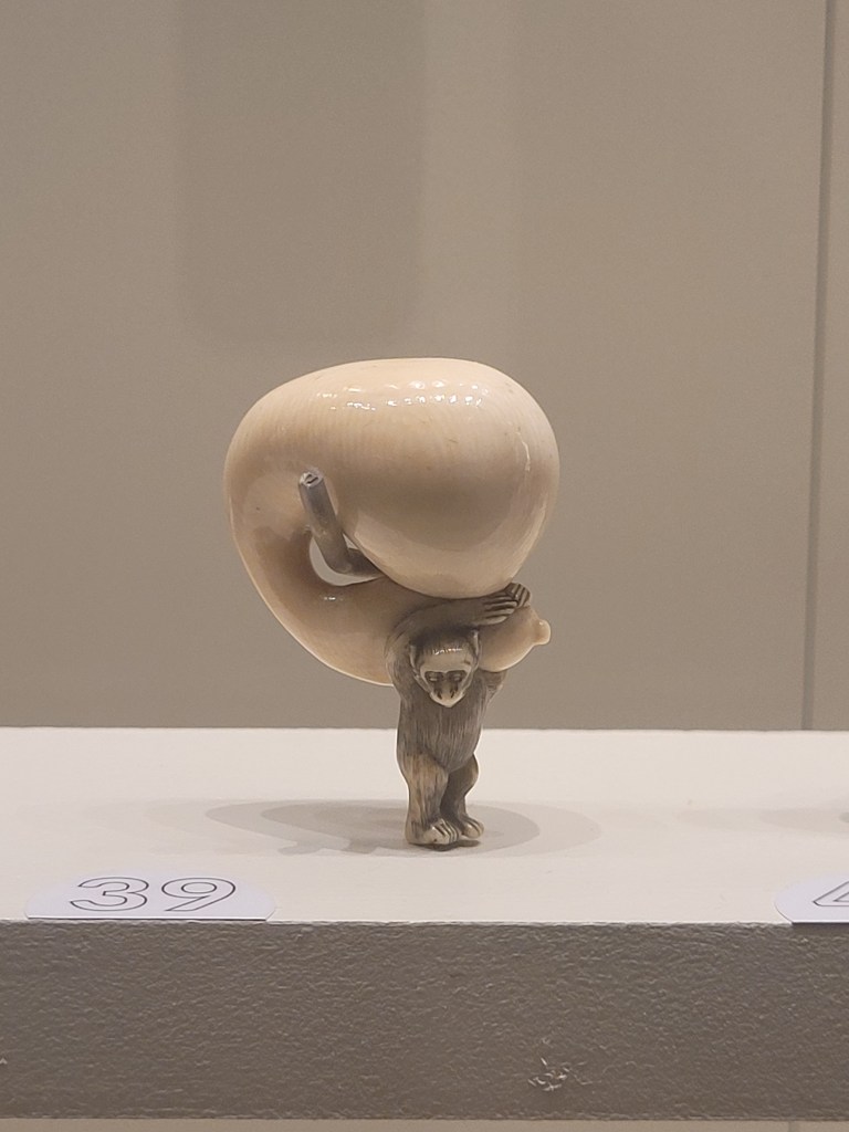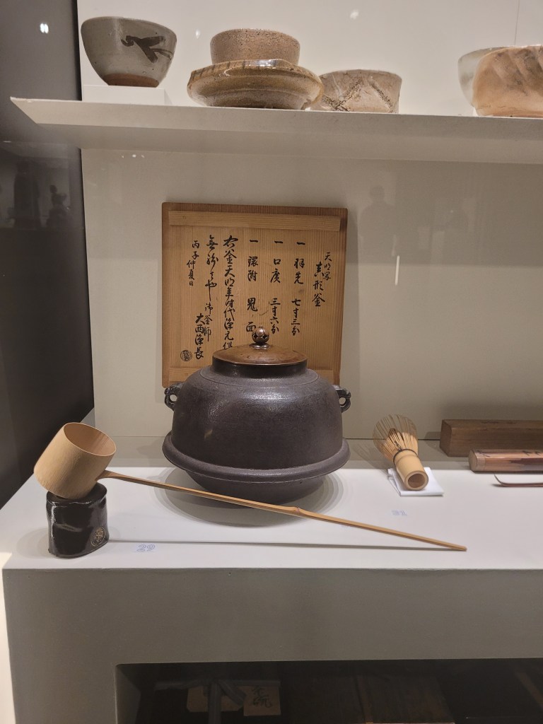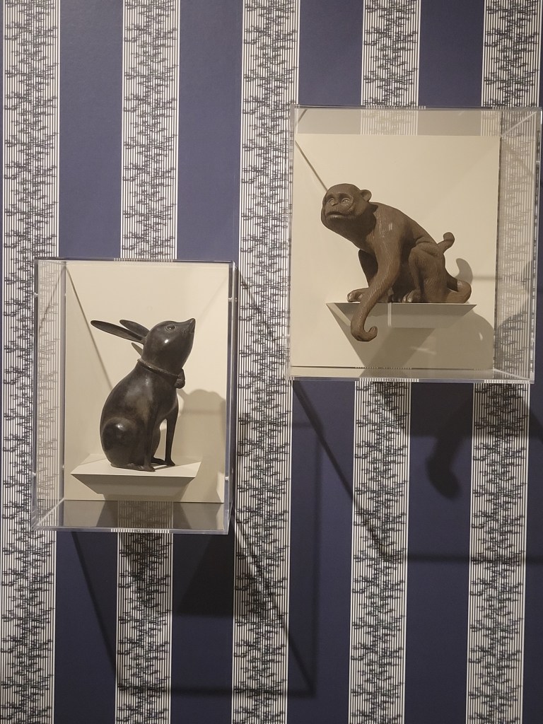 Mais il est temps de passer à table ! Les porcelaines japonaises, utilitaires ou décoratives, ont suscité un fort engouement en Europe (et notamment aux Pays-Bas)… en bleu et blanc ou en couleurs… florales et délicates… ou encore narratives. S’attacher à ces figures en pleine action et se prendre d’affection pour ces animaux kawaii… chat, chien, singe ou lapin. Une symbiose entre culture et nature, qui s’illustre aussi dans le format miniature des netsuke. Les images et les objets, en eux-mêmes, racontent une histoire… une vie et une époque. Toujours sublimer le geste, le savoir-faire… le temps qui passe et l’impermanence des choses (mujô) jusque dans les détails du quotidien. Il faut alors mettre de côté la linéarité occidentale du passé vers le futur pour se concentrer sur l’instant présent et l’éternel recommencement. Un autre état d’esprit hérité du bouddhisme et que l’on retrouve dans la cérémonie du thé (chanoyu)… un art en soi et un moment suspendu où chaque ustensile participe au respect d’une esthétique codifiée. Tout relève d’un long apprentissage comme on apprend à vivre. Le visiteur en fait l’expérience sublime et minutieuse.