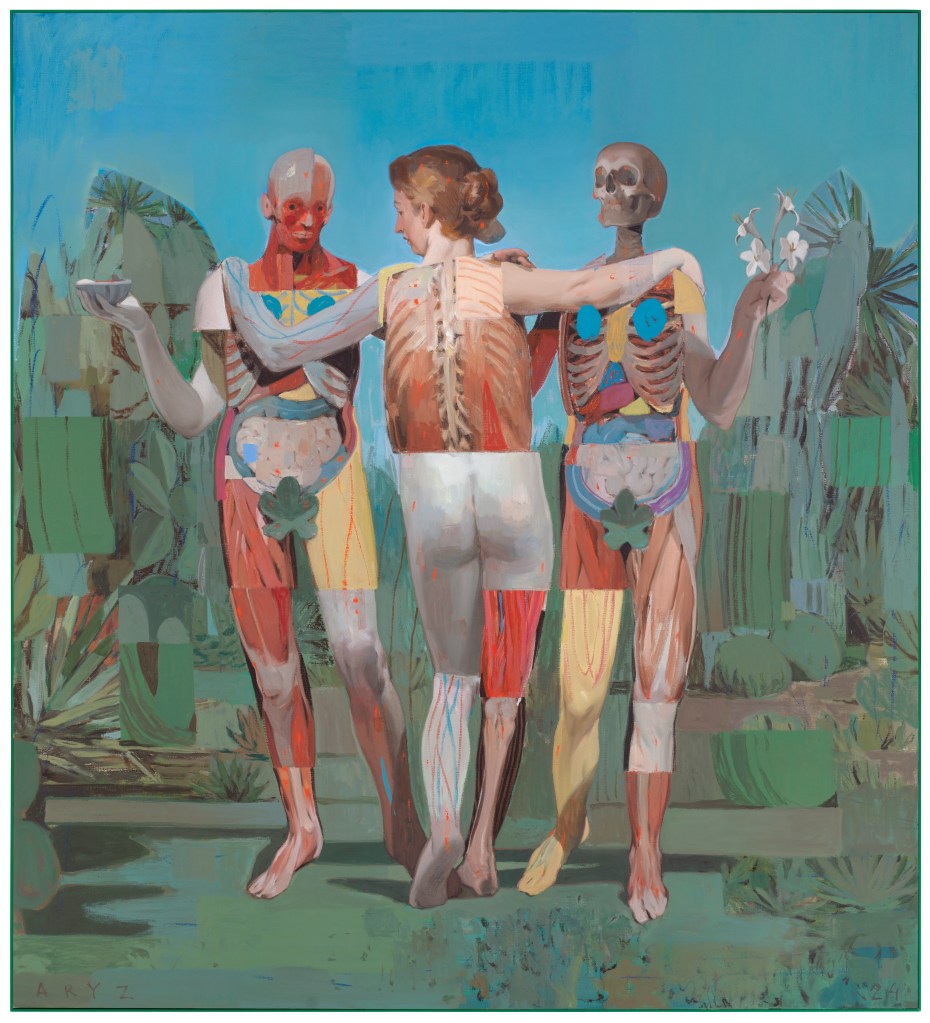 Il y a beaucoup de vie dans ces toiles mais aussi de la mort… comme une vanité ou une nature morte toujours présente. L’humain se fragmente comme l’histoire… une immortalité glissante… de génération en génération… de chef-d’œuvre en chef-d’œuvre. Le rouge… baroque… est aussi la couleur de la chair. Écorchés de la Renaissance et dessins anatomiques… les corps révèlent souvent leur ossature et leur cage thoracique. On voit les figures de l’extérieur et de l’intérieur comme si un filtre radiographique avait été placé entre nous et la peinture. Le prélude devient un véritable hommage et un jeu de piste à travers l’histoire de l’art… tant dans les citations d’œuvres célèbres que dans les références iconographiques et aux grands maîtres. ARYZ, avec sa propre identité artistique, s’inscrit dans leur lignée… et la galerie en devient, en quelque sorte, le musée. Il faut donc voir dans cette exposition un héritage du passé et un prélude à l’avenir… main dans la main.