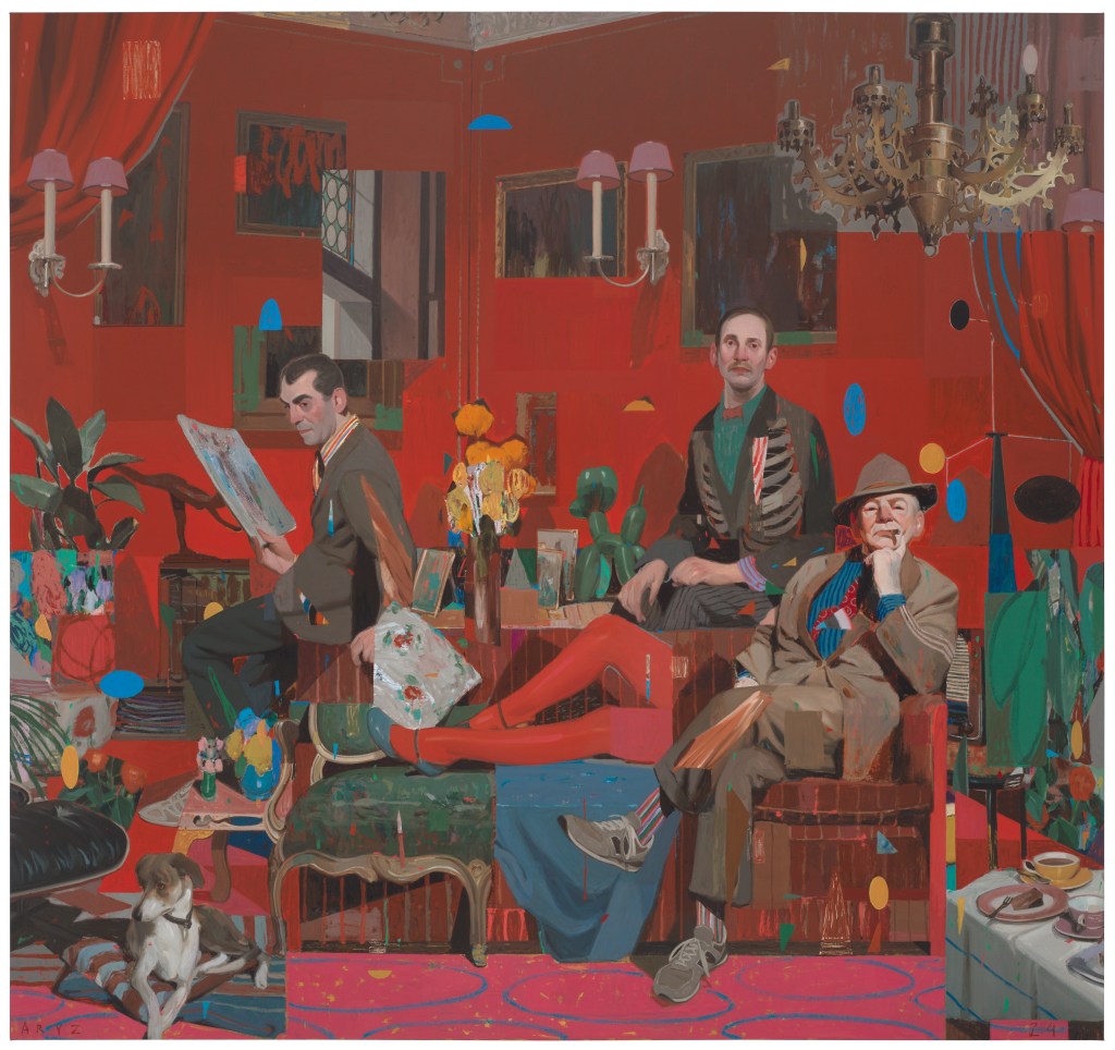 Reconnaissables à ses couleurs chatoyantes et lumineuses, les compositions d’ARYZ offrent de multiples points de vue et lectures possibles. Il nous raconte une grande histoire dont chacun peut s’emparer du regard. A première vue, l’image apparaît complète et d’une grande netteté. Pourtant, lorsque l’on s’arrête et que l’on observe un peu plus longtemps, on la voit se fragmenter imperceptiblement… se pixelliser comme sur un écran. L’artiste brouille subtilement les pistes et dérègle notre perception visuelle. Comme un magicien, il mélange, inverse ou fait disparaître des bribes d’informations visuelles. Le cerveau arrive à imaginer et combler le manque sans pourtant totalement y parvenir et c’est cette frustration qui rend la sensation troublante mais aussi attirante pour le spectateur. Par cette ambiguïté, cet illusionniste teinté d’humour, l’artiste titille notre perception. Il sème le doute et contrarie nos certitudes… que voit-on vraiment ? L’œuvre devient un casse-tête… une énigme à résoudre. A qui sont ces jambes rouges sur le canapé des galeristes ? La femme… muse, modèle… aurait-elle disparue dans ce milieu d’hommes ? L’espace lui-même devient anachronique comme si notre mémoire, telle une machine à voyager dans le temps, réalisait une synthèse de l’histoire… une défragmentation éclair de nos souvenirs, nos connaissances et nos oublis. Peut-être est-ce cela de voir sa vie défiler devant ses yeux ? Un collage ou un puzzle d’images reconstituées… un récit illustré du conscient et de l’inconscient… un déjeuner sur l’herbe aux airs baroques entre une Vierge à l’enfant et une Coccinelle. La réalité frôlerait presque l’hallucination…