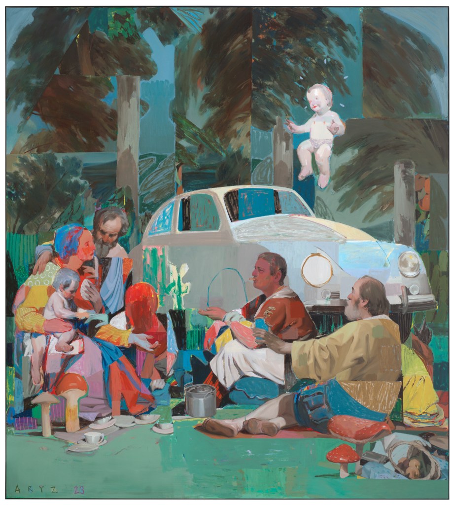 Recognizable by his shimmering and luminous colors, ARYZ’s compositions offer multiple points of view and possible readings. He tells us a great story that everyone can grasp. At first glance, the image appears complete and very clear. However, when we stop and observe a little longer, we see it imperceptibly fragment… pixelate as if on a screen. The artist subtly blurs the lines and disrupts our visual perception. Like a magician, he mixes, inverts or makes fragments of visual information disappear. The brain manages to imagine and fill the gap without completely succeeding, and it is this frustration that makes the sensation disturbing but also attractive for the viewer. Through this ambiguity, this illusionist tinged with humor, the artist titillates our perception. He sows doubt and thwarts our certainties… what do we really see? The work becomes a puzzle… an enigma to be solved. Whose red legs are these on the gallerists’ sofa? Has the woman… muse, model… disappeared in this male milieu? Space itself becomes anachronistic, as if our memory, like a time machine, were synthesizing history… a lightning-fast defragmentation of our memories, our knowledge, and our forgetfulness. Perhaps this is what it means to see one’s life flash before one’s eyes? A collage or a puzzle of reconstructed images… an illustrated narrative of the conscious and the unconscious… a lunch on the grass with a baroque air between a Virgin with Child and a Beetle. Reality almost borders on hallucination…