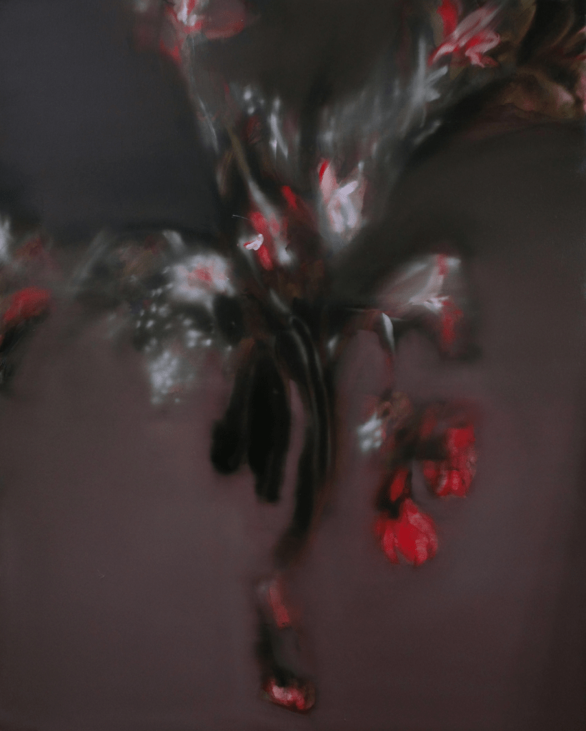 Pour Olivier Messiaen, “le temps est un espace, le son est une couleur”. Avec Milène Sanchez, si le temps est aussi un espace, la couleur, elle en joue comme d’une accentuation… comme un éclat tonique qui fait tourner le regard à l’obsession. Soudain, une touche de rose, de jaune ou de bleu… un pistil ou une étamine… provoque l’activation d’une sensibilité synesthésique chez le spectateur. Elle déclenche un phénomène perceptif d’associations irrépressibles : la chronochromie ! Par là, l’artiste nous pousse à prendre conscience du temps de la vie mais aussi celui de la peinture… celui du travail qui se joue loin des regards. Lorsque l’on écoute une musique, lorsque l’on regarde un film ou même lorsque l’on lit un livre… la durée s’impose d’elle-même. Mais avec la peinture, le temps semble s’oublier… s’évaporer comme un fantôme de l’atelier. Pourtant, il faut “mettre du temps dans la couleur”. En retour, il nous appartient de consacrer du temps à la recevoir. Regarder, c’est valoriser la création dans sa pleine durée… mais aussi choisir de se donner librement, à soi-même, le temps d’exister. À travers les fleurs, les corps et les pétales, le spectateur touche à l’abstraction du temps… cette durée insaisissable et toujours en mouvement. Car dans le flou et à travers la transparence du glacis… ces fleurs ne fanent jamais… elles se déplacent au rythme de la lumière. L’artiste ne pétrifie que l’instant fugace du regard… à la manière d’une photographe. Elle met en pause… capture la beauté du silence… cherche l’harmonie comme une transition fragile entre le passé et l’avenir : une vie éphémère suspendue à son geste. Le pinceau se transforme alors en baguette de cheffe d’orchestre… la prolongation de la main de l’artiste comme expression et transmission d’un langage corporel et émotionnel intense.