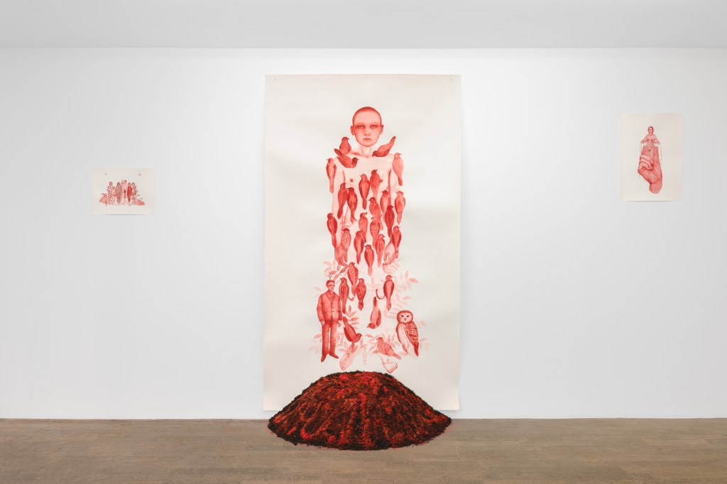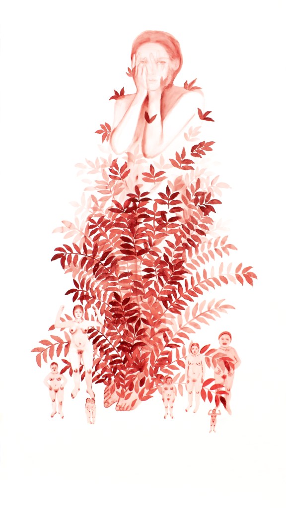 Un motif revient souvent : celui du corps qui se fond dans la nature, ou de la nature qui prend forme humaine. Les frontières s’y effacent. Les couleurs diaphanes, les lavis transparents, la finesse du trait créent un monde poreux… on y voit à travers les corps, on perçoit ce qui les habite, leurs racines, leurs fluides. La peinture ne recouvre pas, elle révèle. C’est une pratique de dévoilement, presque chamanique, où la main de l’artiste cherche le point d’équilibre entre la chair et la plante, entre la mémoire et la matière. Soudain une œuvre s’impose : un garçon surdimensionné, couvert d’oiseaux, se tient debout sur une butte teintée de rouge. Ses pieds se dissolvent dans la terre, son regard, calme et frontal, capte la lumière. Autour de lui, les oiseaux semblent à la fois l’habiter et l’envelopper, comme une nuée protectrice. Le rouge sous ses pieds n’est pas violent… c’est un foyer souterrain, une chaleur contenue qui remonte du sol vers le corps. L’ensemble dégage une immobilité puissante, presque rituelle. Il y a dans cette figure une présence archaïque, une mémoire du monde antérieure aux distinctions… l’enfant, l’arbre, la sève, la lueur.