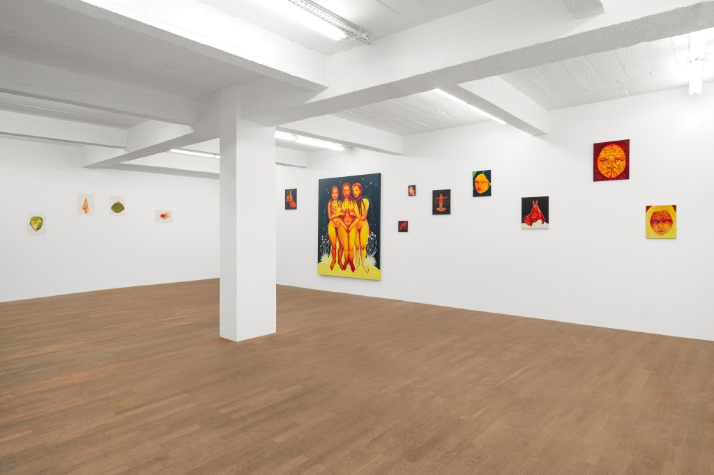 Les œuvres n’occupent pas simplement les murs… elles se prolongent dans l’espace, s’avancent vers le visiteur, se dressent comme des buttes de terre où la peinture semble prendre racine. L’atmosphère est douce, presque silencieuse ; quelque chose se forme devant nous, entre la matière et l’air. On a l’impression que la galerie toute entière s’éveille lentement, comme si un souffle végétal s’y diffusait. La scénographie accompagne cette impression d’éclosion. L’espace n’est pas construit comme un parcours linéaire, mais comme un champ de forces où chaque œuvre s’élève à son rythme. Les toiles et les papiers dialoguent sans hiérarchie ; certains visages apparaissent à hauteur d’œil, d’autres sont suspendus dans la lumière, comme en apesanteur. À mesure que l’on avance, l’échelle change : tantôt l’intime, tantôt le monumental. L’ensemble compose une respiration calme, mais traversée de tensions, d’élans, de verticalités fragiles.